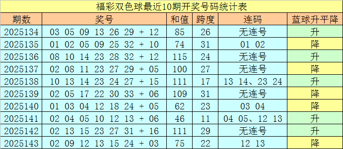 上期开奖:福彩双色球第2025143奖号开出:02 09 12 13 15 24 + 03,红球号码和值为75,首尾间距为22,包含连号:12 13。
