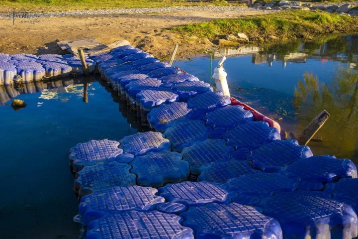 也幸好有他们在,才让我确定了“肯定有小桥存在”,稍作寻找后,这座两头铺着木板,水上浮筒歪斜的通道便出现在面前。说实话,看上去真有点不太靠谱啊!所以上桥后几乎是半步半步挪过去的,当然,主要还是为了保护相机,自己落水最多湿掉鞋子裤子,并不打紧。