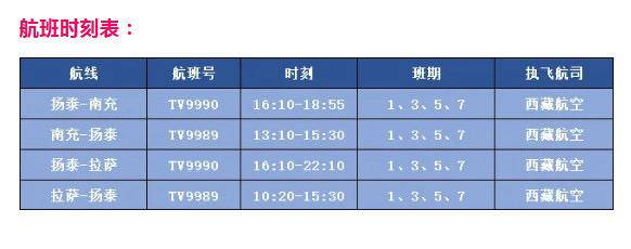 记者了解到,具体航班班期为,每周一、三、五、日执行,去程(TV9990):16:10从扬泰机场起飞→18:55抵达南充→22:10抵达拉萨贡嘎机场;返程(TV9989):10:20从拉萨起飞→13:10从南充起飞→15:30抵达扬泰机场。据介绍,此次开通的航线并非简单的点对点飞行,而是经过精心设计,串联起川藏文化长廊的精华。