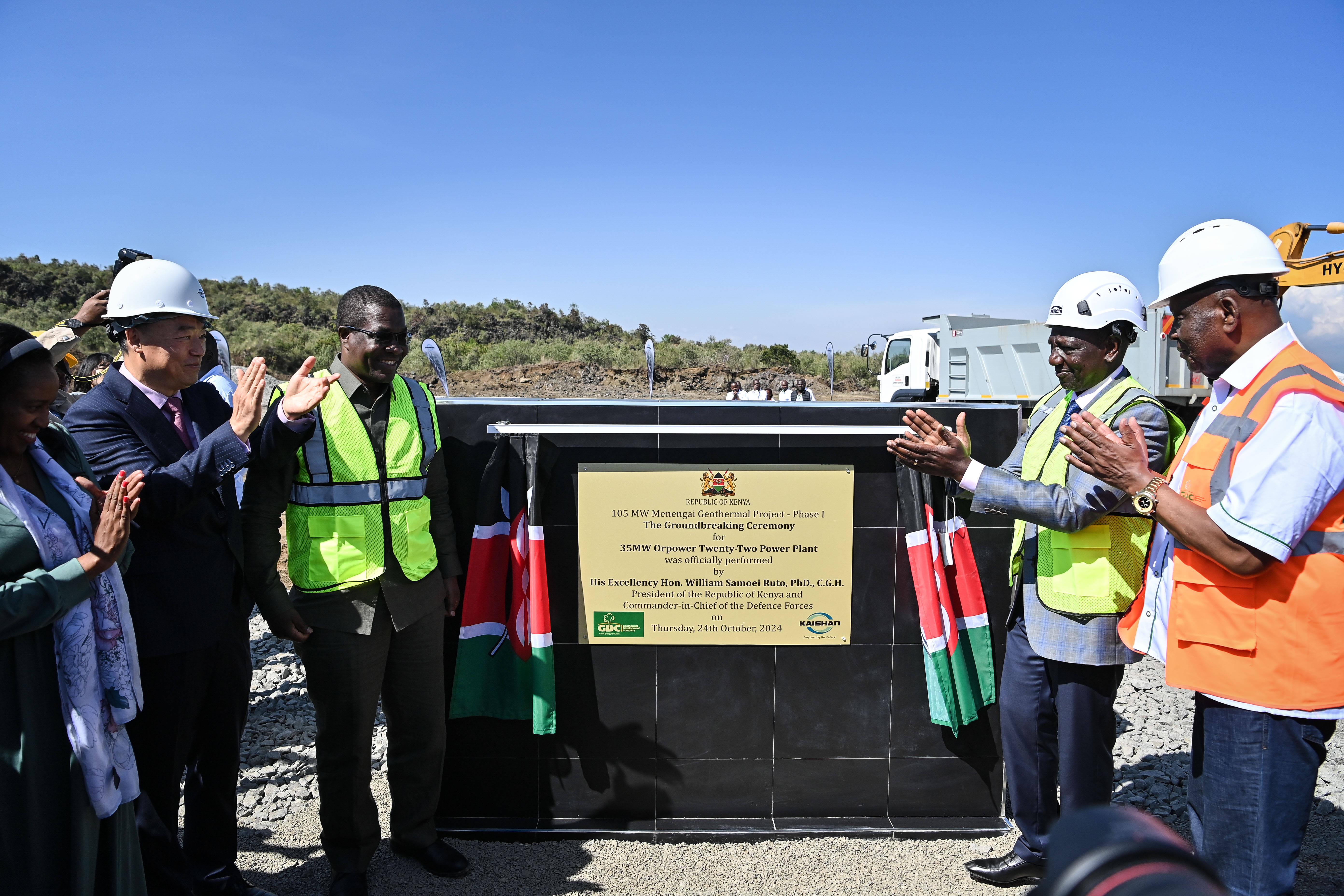 2024年10月24日,在肯尼亚纳库鲁郡,肯尼亚总统威廉·鲁托(右二)出席梅嫩加伊地热开发项目一期Orpower 22地热电站开工仪式。新华社记者 韩旭 摄联合国秘书长发言人迪雅里克说,作为世界第二大经济体,中国在能源转型中发挥着至关重要的作用,“不仅鼓励全球积极、公正的绿色转型,更为其他国家提供资源支持”。