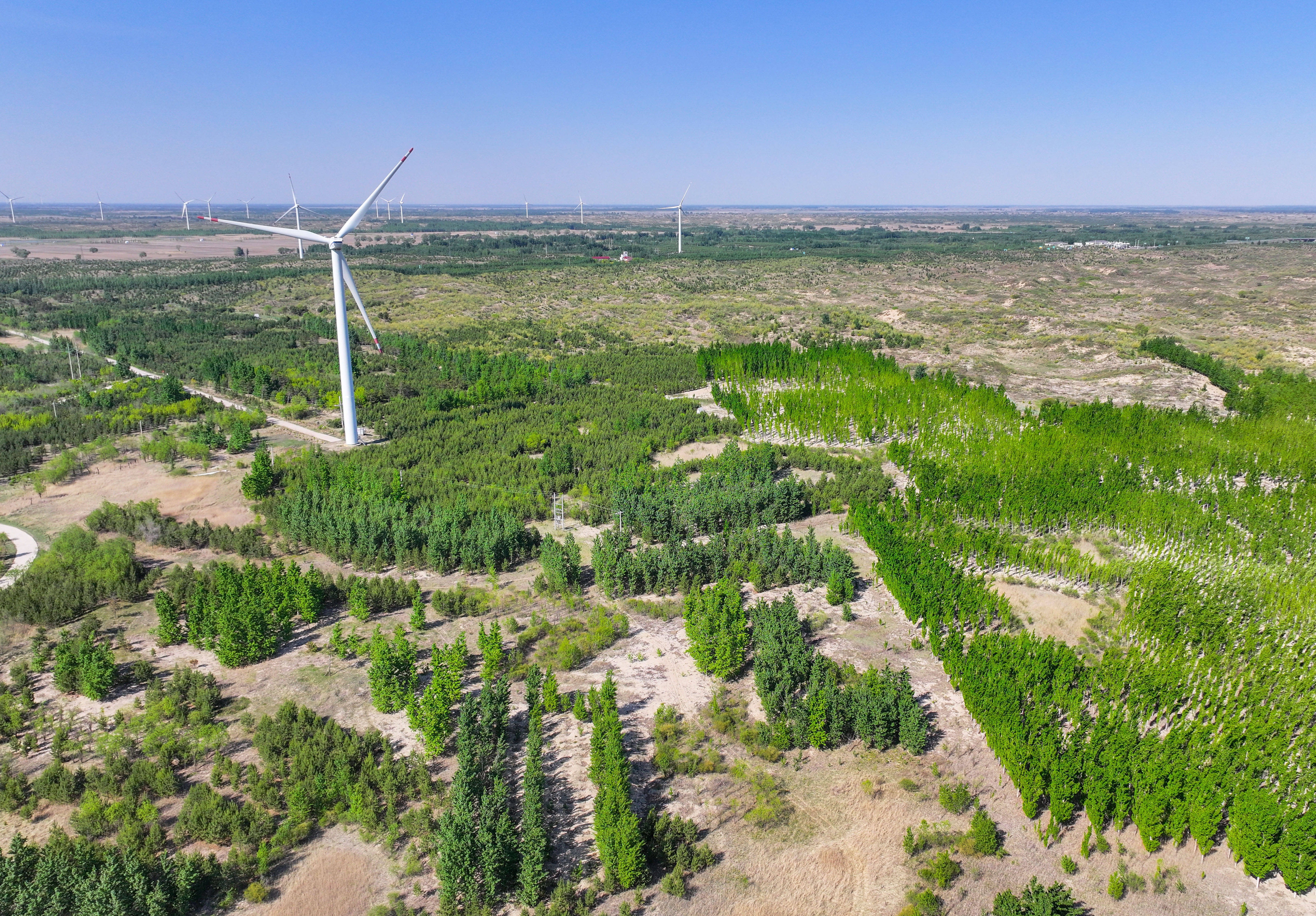 这是在内蒙古通辽市科尔沁沙地“双百万亩”综合治理工程努古斯台项目区拍摄的风力发电机组(2024年5月15日摄,无人机照片)。新华社记者 连振 摄回望“十四五”时期,中国式现代化建设的“绿色成绩单”格外亮眼:绿色低碳转型步伐加快,生态环境质量持续改善,建成全球规模最大的碳排放权交易市场和清洁电力供应体系,全国森林覆盖率提高到25%以上,地级及以上城市空气质量优良天数比例稳定在87%左右,主要污染物排放总量持续下降……